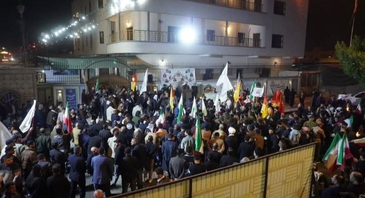 اجتماع مردم بصره در برابر سرکنسولگری جمهوری اسلامی ایران برای اعلام حمایت از ایران