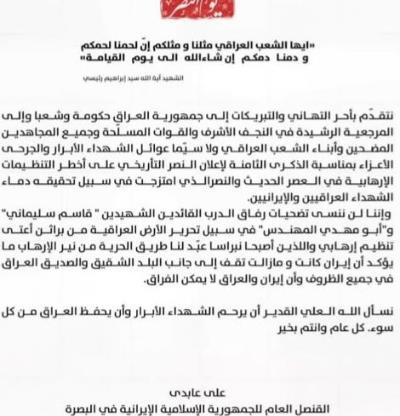 در این مراسم پس از تلاوت آیاتی از کلام الله مجید و پخش سرود ملی جمهوری اسلامی ایران، سرکنسول جمهوری اسلامی ایران در بصره، آقای علی عابدی، ضمن تبریک أعیاد شعبانیه و سالروز پیروزی شکوهمند انقلاب اسلامی ایران به ملت بزرگ ایران و امت اسلامی افزود: انقلاب اسلامی، انقلابی بی نظیر در تاریخ معاصر است که بدون استفاده از زور  و سلاح  و بر اساس منطق، آگاهی، ایمان، گفتمان نرم و با شعار نه شرقی، نه غربی به پیروزی رسید و معادلات قدرت را در سطح منطقه و جهان تغییر داد و ملت ایران بویژه جوانان مومن و خلاق در این 47 سال، همواره در صحنه حاضر بوده و تهدیدها را به فرصت تبدیل کردند و در دل تحریمها مسیر خودکفایی، عزت و پیشرفت گشودند. وی در ادامه تاکید کرد: امروز جمهوری اسلامی ایران در حوزه‌های مختلف علوم دانش بنیان، فنآوریهای نوین، صنعت هوا و فضا، نانو تکنولوژی، بیوتکنولوژی، سلولهای بنیادین وپزشکی و... به جایگاههای برتر جهانی دست یافته و در بسیاری از این عرصه‌ها جزء ده کشور نخست جهان است، دستاورهایی که همگی حاصل اعتماد به توان داخلی و بومی است.