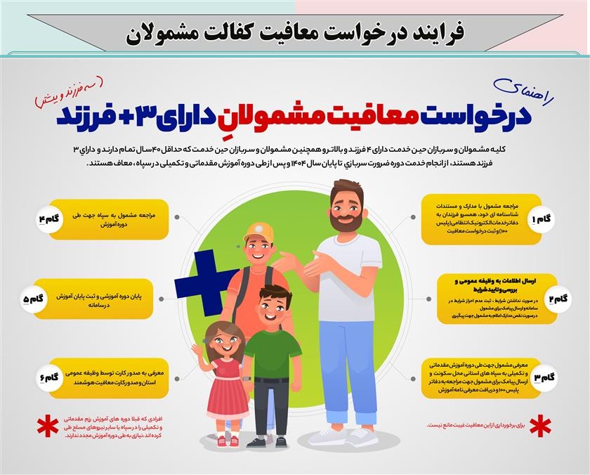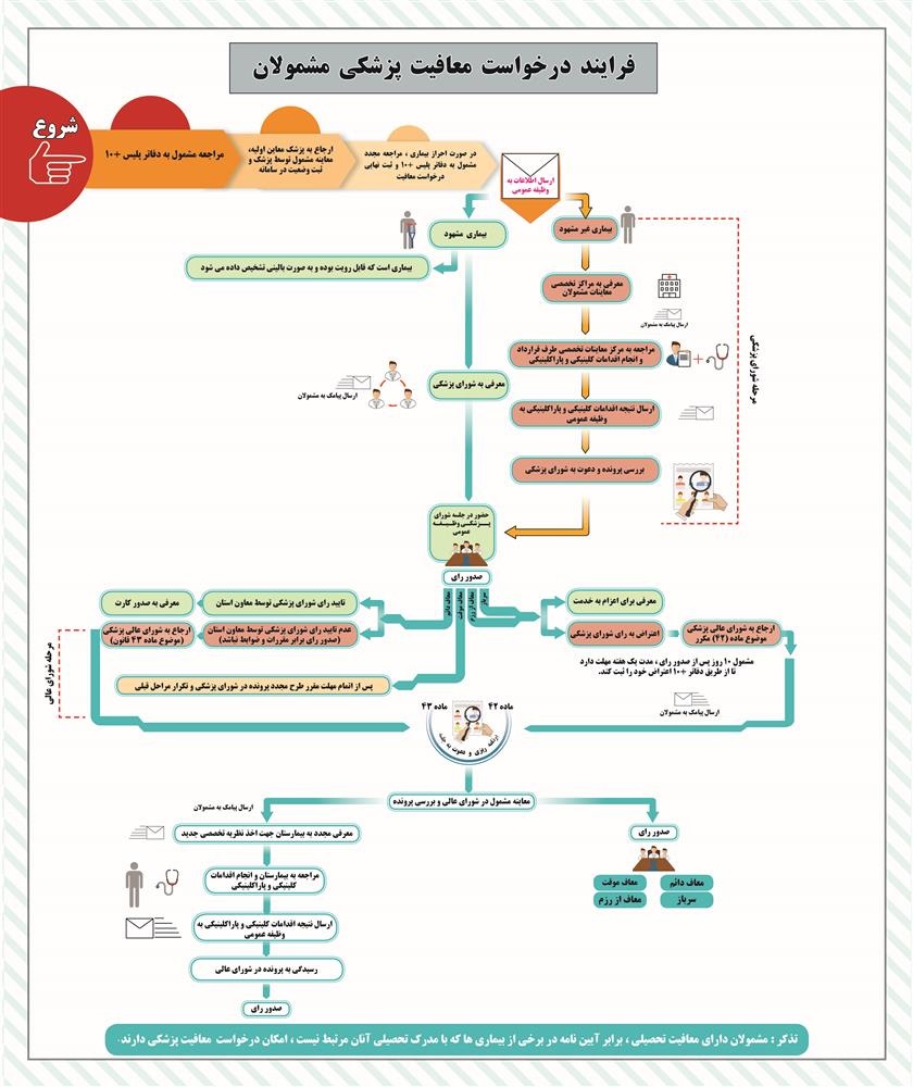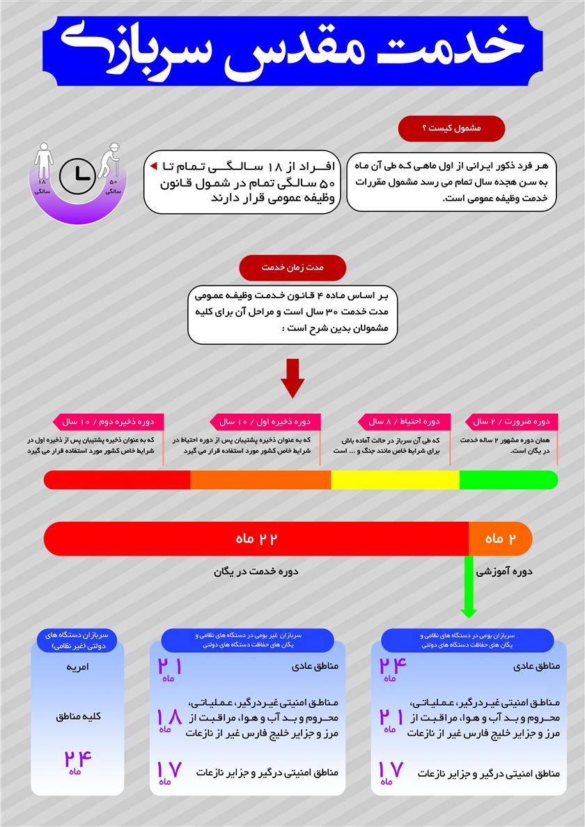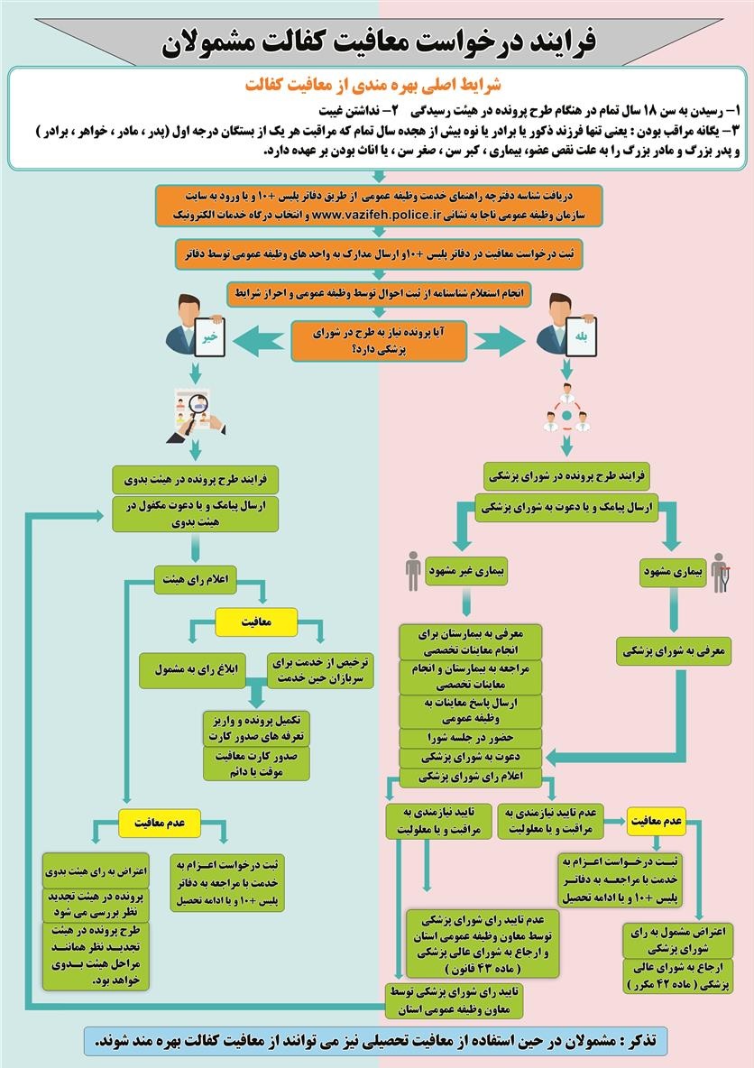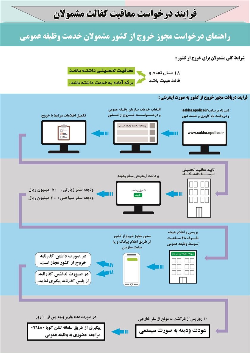قوانین و فرایندهای مرتبط با انجام امور مشمولین اعم از معافیت ها ، خروج از کشور و ... در سازمان وظیفه عمومیبه منظور آگاهی و بهره برداری متقاضیان منتشر میگردد. ضمنا برای دریافت اطلاعات بیشتر در خصوص قوانین و مقررات نظام وظیفه به سایت vazifeh.police.ir مراجعه فرمایید.